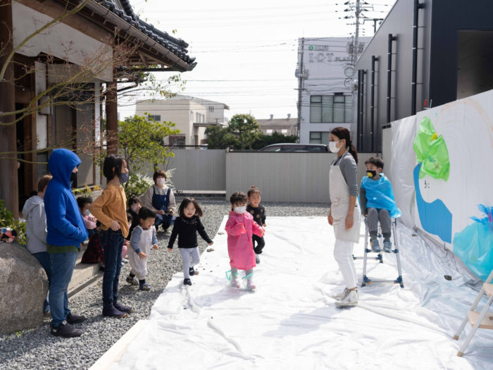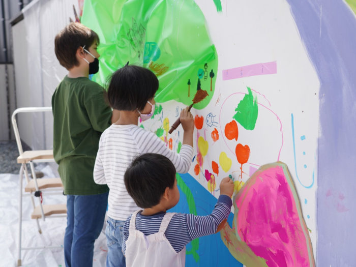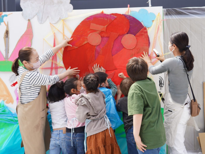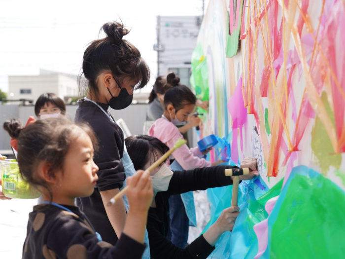 絵の具+ビニールテープ、ダンボールさまざまな素材を使って、コラージュのように、”岡山の春”を表現しました。